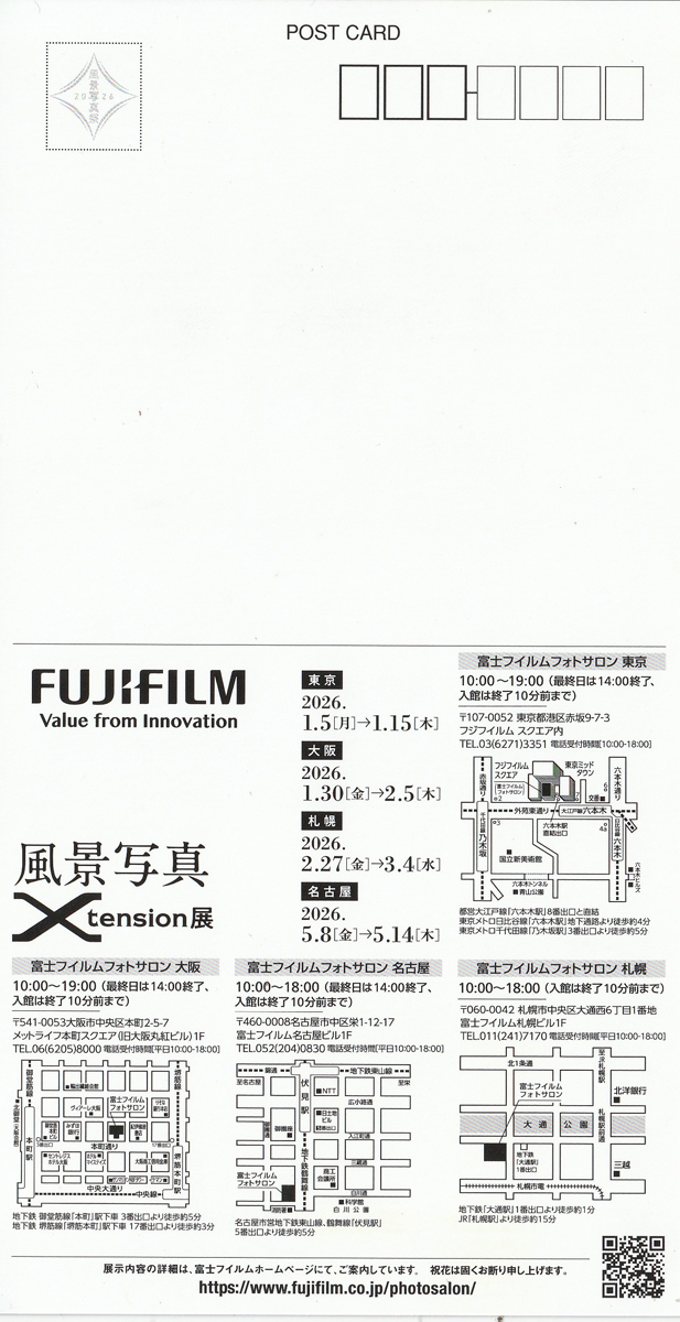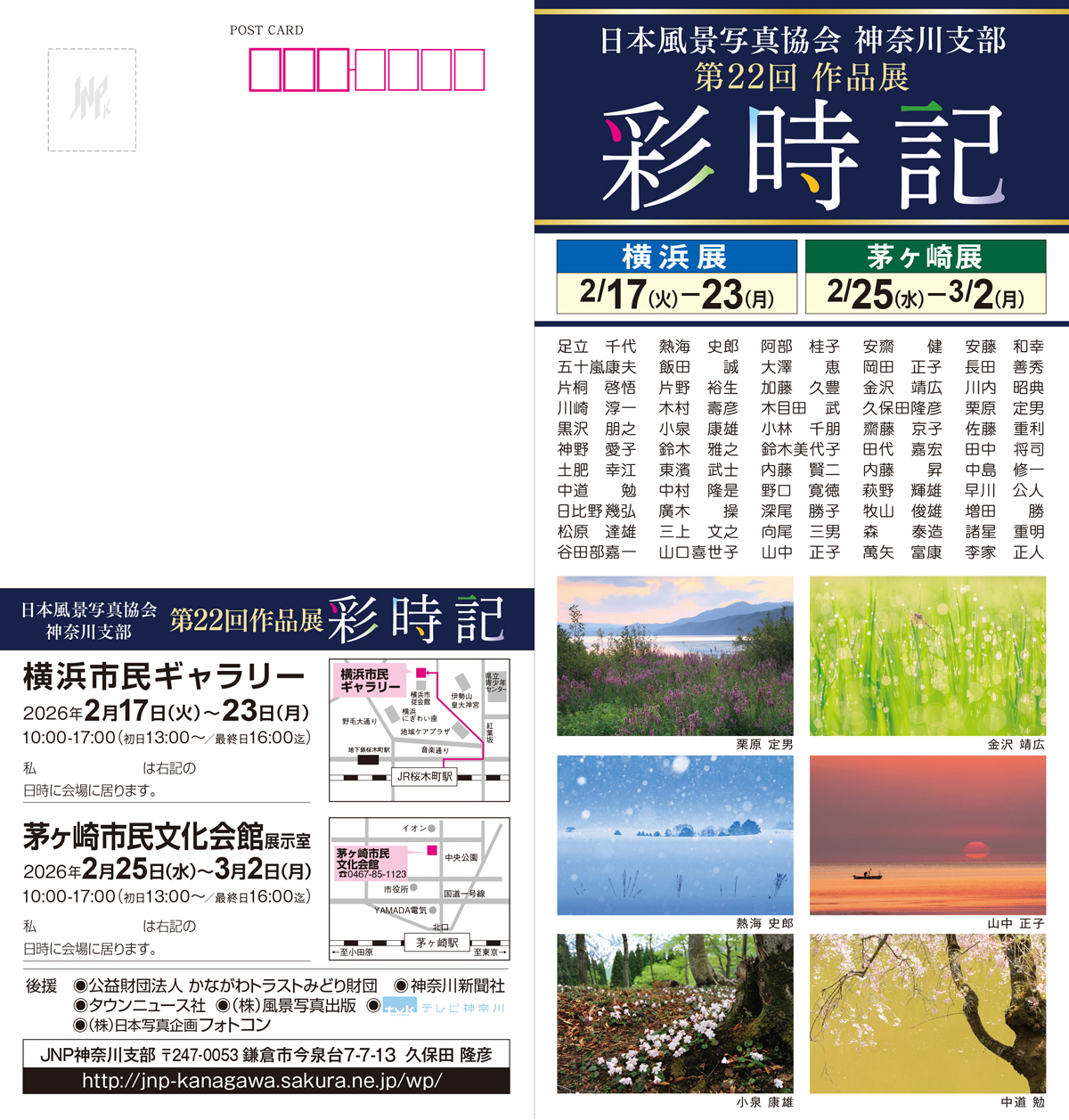 日本風景写真協会神奈川支部の 神奈川支部会員55名の作品を大全紙で55点展示いたしますので、 横 浜 展 : 2026年2月17日(火)~2月23日(月)