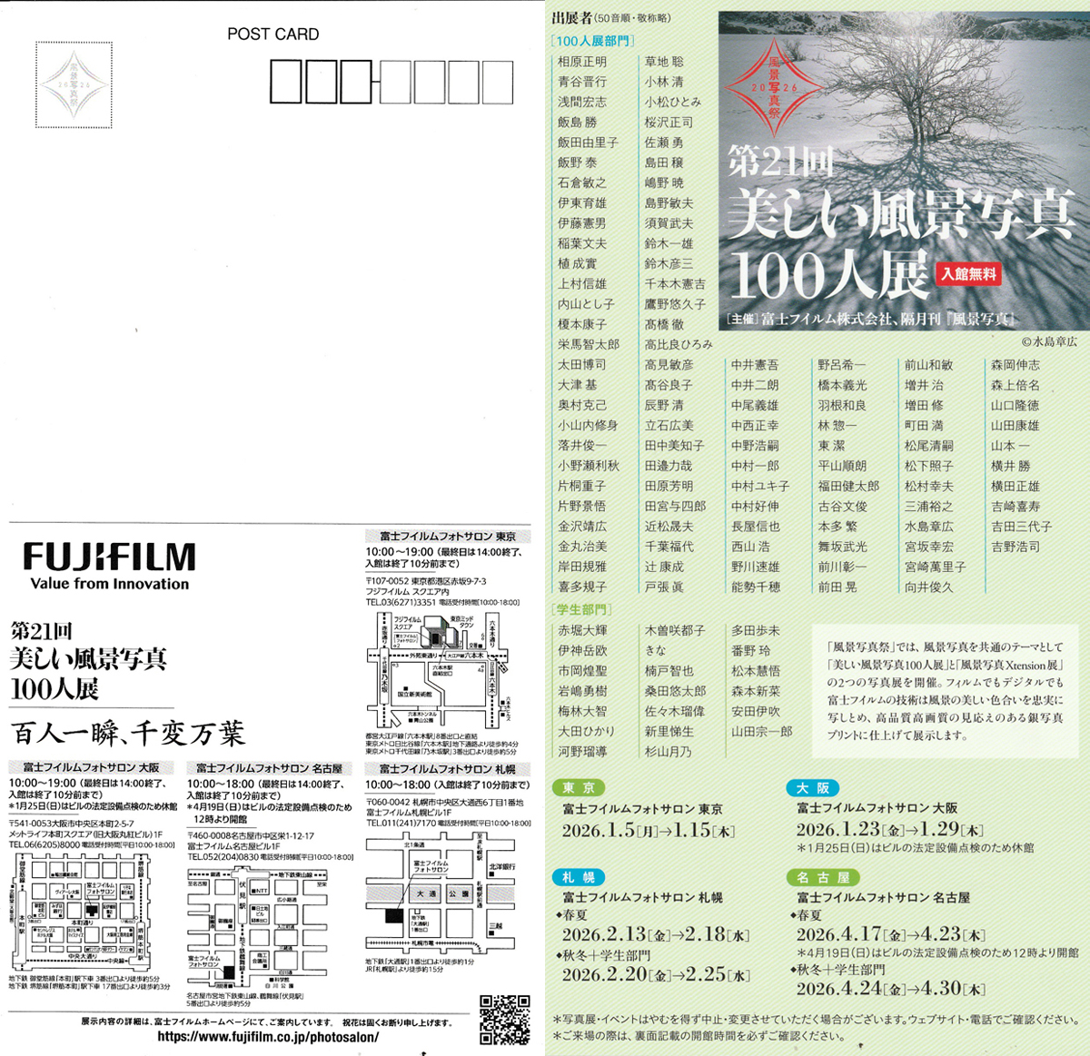 第22回『美しい風景写真 100人展 』と 神奈川支部会員の 安藤和幸、金沢 靖広 の2名が出品しておりますので 会期:2026年1月5日(月)~15日(木) 会場:富士フィルムフォトサロン東京 ※詳細は、下記画像をクリックしてご覧ください。