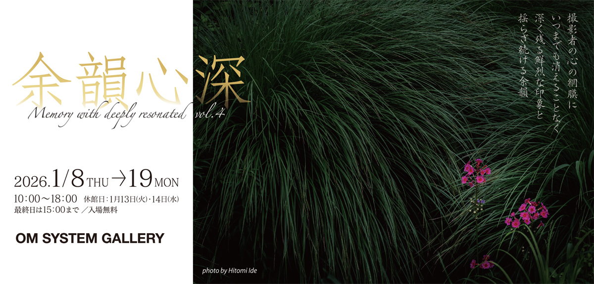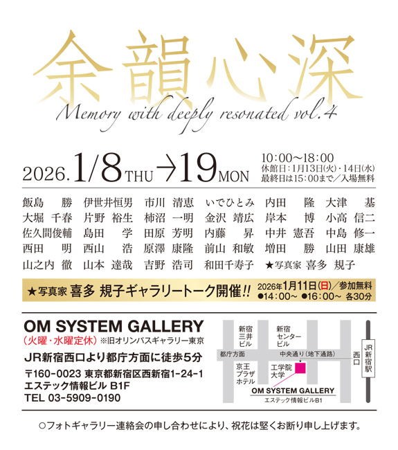 第4回目の『 余 韻 心 深 』写真展 が 神奈川支部会員 片野 裕生、金沢 靖広、内藤 昇、中島 修一、増田 勝 の5名と、大阪第一支部会員の 前山 和敏 1名 その他特別ゲストを加えた23名が、全倍作品29点で出品いたします。 ☆特別ゲストの喜多 規子プロによるギャラリートークも1月11日(日)に開催されます。 会期:2026年1月8日(木)~19日(月) 会場:OM SYSTEM GALLERY (新宿) ※詳細は、下記画像をクリックしてご覧ください。